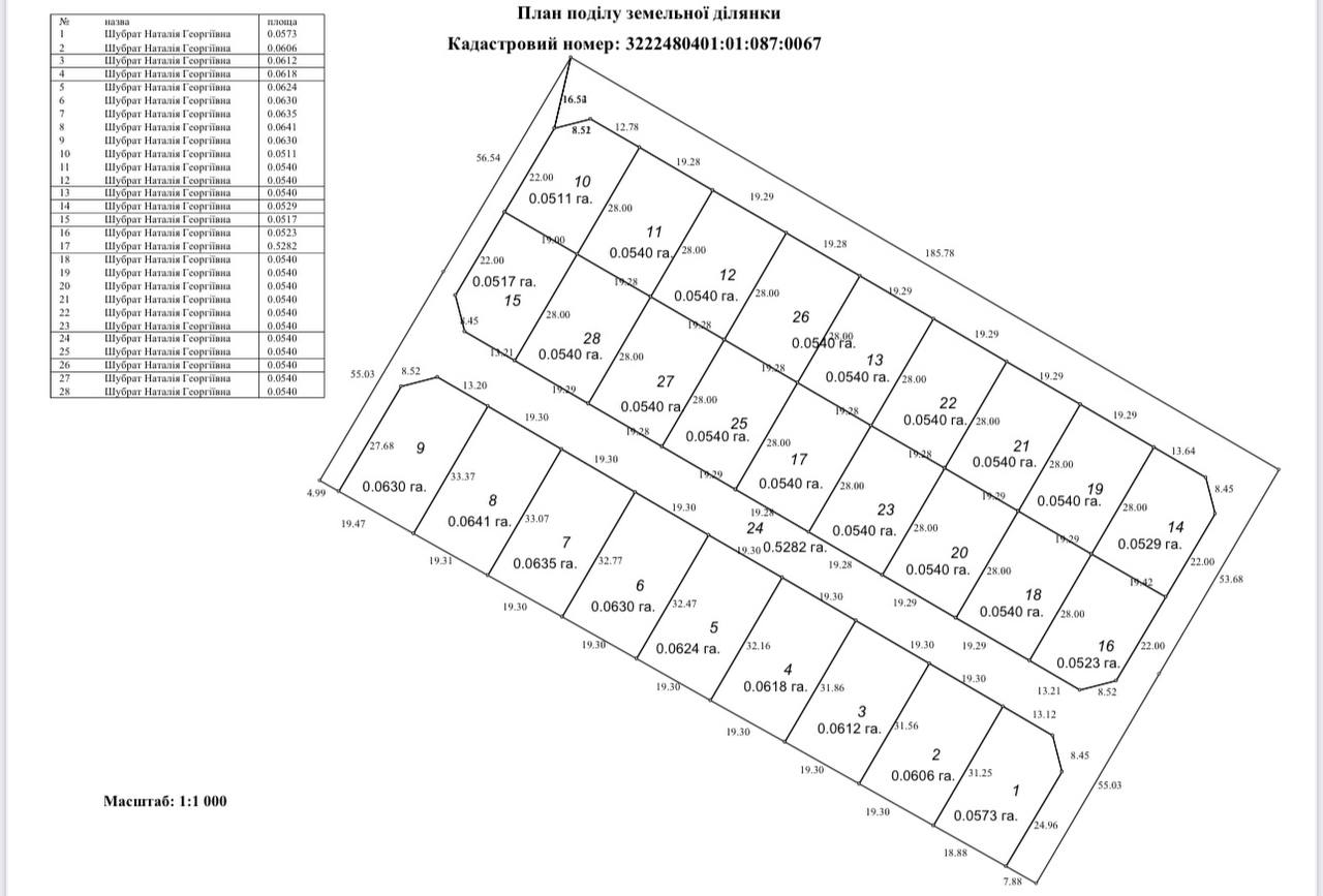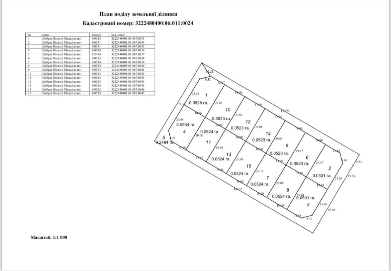 Площа ділянок та кадастрові номери вказані на схемі. Ділянки приватизовані,цільове призначення під будівництво.